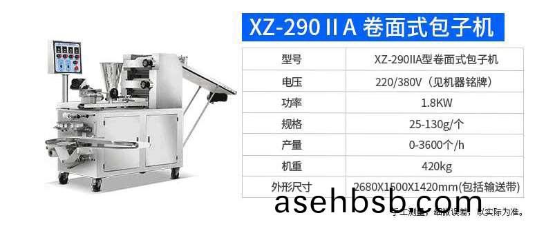 æ—ä¼—XZ-290ASåž‹å�·é�¢å¼�包å�馒头机是一款以压é�¢æ–¹å¼�æˆ�åž‹é�¢çš®ï¼Œå�·é�¢æ–¹å¼�包馅,仿手工æ��花的一款机型,它整å�ˆäº†åŽŸæœ‰çš„äºŒé�“压é�¢ã€�æˆ�型机ã€�出馅机ã€�切刀为一体,有æ“�作方便ã€�å� 地é�¢ç§¯å°�ç‰ä¼˜ç‚¹ã€‚该机采用压é�¢æˆ�åž‹é�¢çš®çš„æ–¹å¼�,表é�¢å…‰æ´�,ä¸�伤é�¢ç‹ï¼Œä¸�å�‘çƒï¼Œä½¿äº§å“�å�£æ„Ÿæ»‘顺爽å�£ï¼Œä¿�æŒ�ä¼ ç»Ÿæ‰‹å·¥å·¥è‰ºçš„é£Žå‘³ï¼Œæœ¬æœºé‡‡ç”¨è‡ªåŠ¨æŽ§åˆ¶ç³»ç»Ÿï¼Œå“�质稳定,压é�¢æ»šç’采用性能好的食å“�级æ��æ–™UPEåŠ å·¥è€Œæˆ�ï¼Œä¸”åŠ å¤§äº†æ»šç’直径使得在压é�¢è¿‡ç¨‹ä¸é�¢çš®å�Šé‡�é‡�çš„ç²¾åº¦ï¼Œè§„æ ¼ï¼Œé•¿åº¦ï¼Œå¤§å°�,é�¢çš®çš„厚度皆å�¯è°ƒæ•´è®¾å®šã€‚