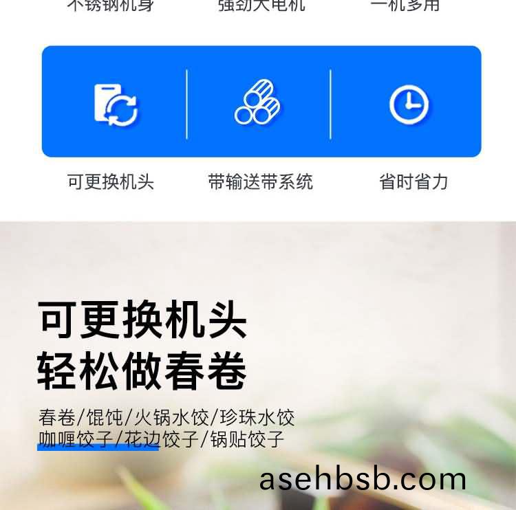 ♦一机多用:å�ªè¦�æ›´æ�¢æ¨¡å…·ï¼Œå°±å�¯ä»¥åˆ¶é€ ä¸�å�Œçš„食å“�,如春å�·ã€�馄饨ç‰ï¼Œé�¢çš®åŽšåº¦ä¸Žé¦…é‡�å�¯è°ƒæ•´ï¼›