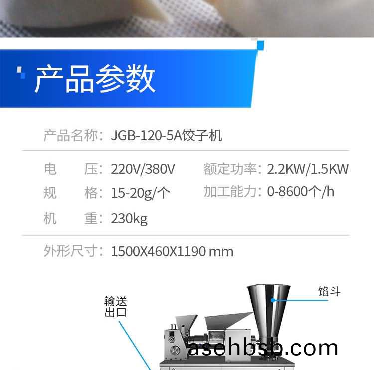 æ—众牌JGB-120-5A型输é€�带饺å�机是一款å�¯ç”Ÿäº§å�„ç§�肉馅ã€�肉è�œæ··å�ˆé¦…ã€�å…¨è�œé¦…å�Šå…¶å®ƒç§�馅饺å�的设备。完美的设计,兼顾å�«ç”Ÿä¸Žç¾Žè§‚两大优点,并且拆装容易,清洗简便。