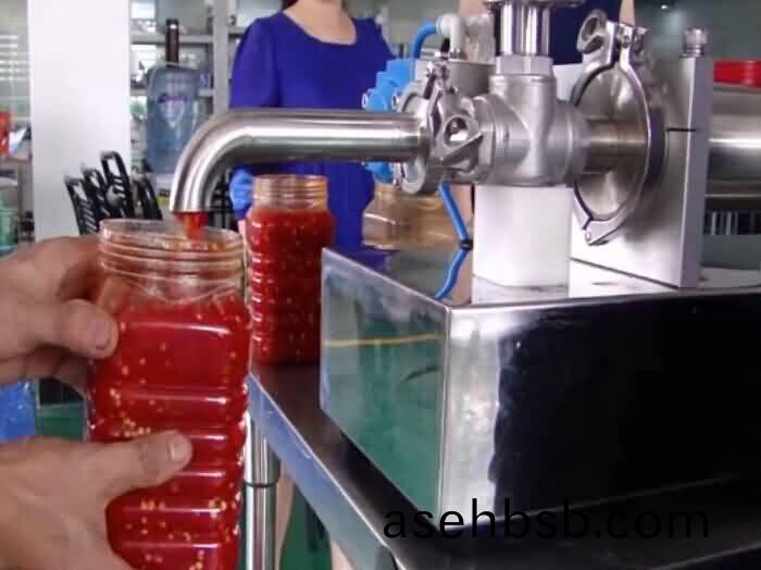 有人问灌装辣椒酱选择哪款机型呢?之前看一个视频就是灌装辣椒酱还是(shi)膏液灌装机,那为什么我这灌装剁辣(la)椒酱不可以呢?小编来给您普(pu)及下(xia)膏液灌装机和浓酱(jiang)灌(guan)装机之间的(de)区别那就是:膏液(ye)灌装(zhuang)机能灌装不(bu)能带(dai)颗(ke)粒的酱类食品和液体,剁辣椒酱属于(yu)带颗粒酱类食品,所以要用酱类灌装机才可以,那么酱类灌装机定量灌装剁辣椒酱效(xiao)果如图(tu)所示:
