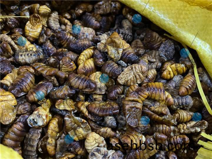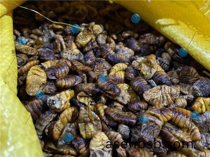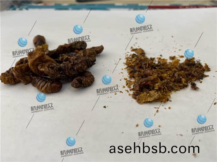 蚕(can)蛹(yong)烘干前(qian)体内(nei)油(you)脂(zhi)甚多,有些肥硕(shuo)点一捏(nie)就出汁(zhi):