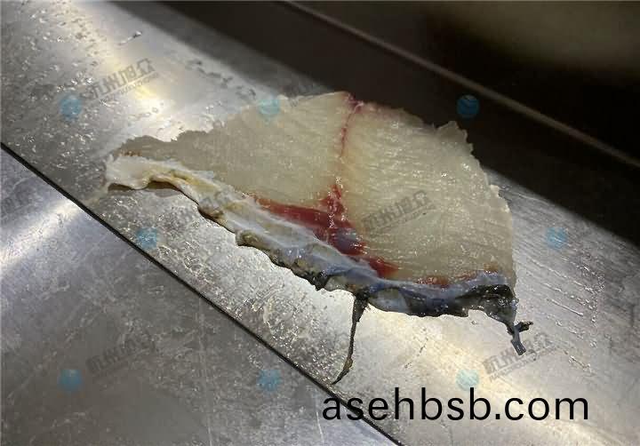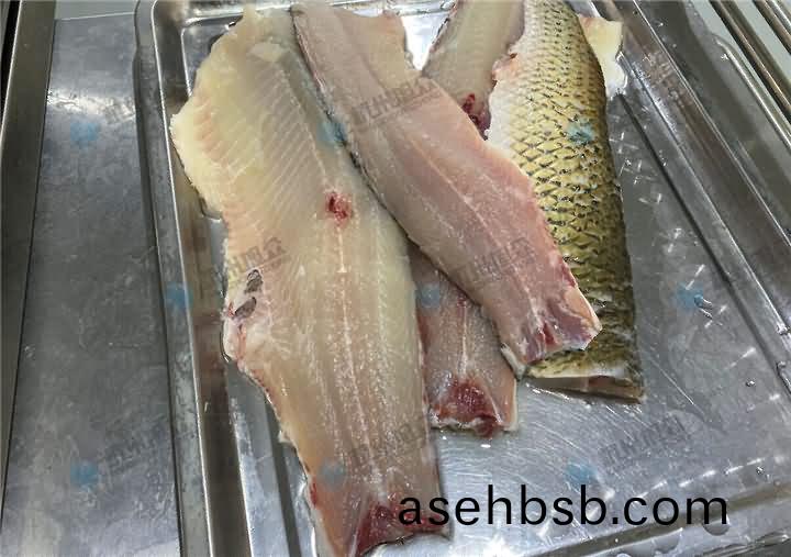全(quan)自(zi)动切(qie)鱼(yu)片(pian)机现(xian)场(chang)演示(shi)切草(cao)鱼片(pian),在切(qie)草鱼(yu)片之(zhi)前要做的(de)工序(xu),先(xian)去(qu)鳞开肚去(qu)内脏(zang)去(qu)鱼头后(hou),再将(jiang)鱼大骨去(qu)掉(diao),不(bu)去的话(hua)刀(dao)片容易(yi)损坏(huai),所(suo)以(yi)要(yao)将鱼大(da)骨剃掉(diao)后(hou)再(zai)用(yong)鱼片(pian)机30°斜度切(qie)成2.3mm鱼片(pian):