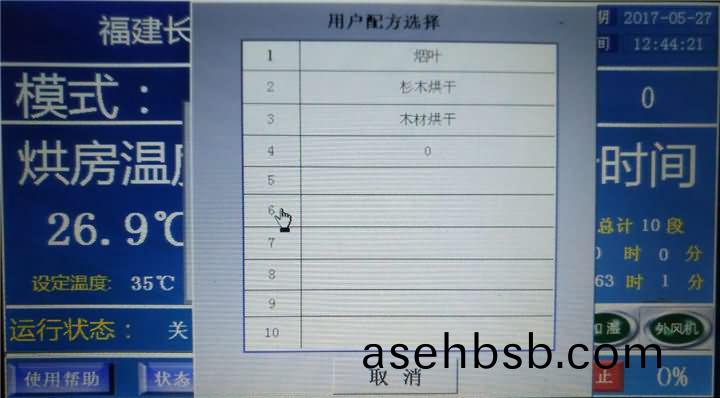 烘(hong)房一共可(ke)以分(fen)十个(ge)阶(jie)段进(jin)行烘(hong)烤,每(mei)个(ge)区(qu)间可(ke)以(yi)单独的设置温(wen)度、湿度(du)、烘(hong)烤时间(jian)、工作(zuo)模式(shi)以及(ji)排湿方(fang)式(shi)。设(she)置完成(cheng)后点击(ji)右(you)上(shang)角×会提示是否保存(cun)。点【取消(xiao)】不保,点【确定】进(jin)行(xing)保存并(bing)输入名(ming)称,以(yi)后(hou)从【用户配方选择(ze)】进入可以直(zhi)接(jie)调(diao)用。