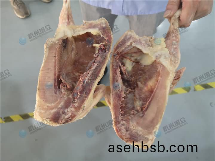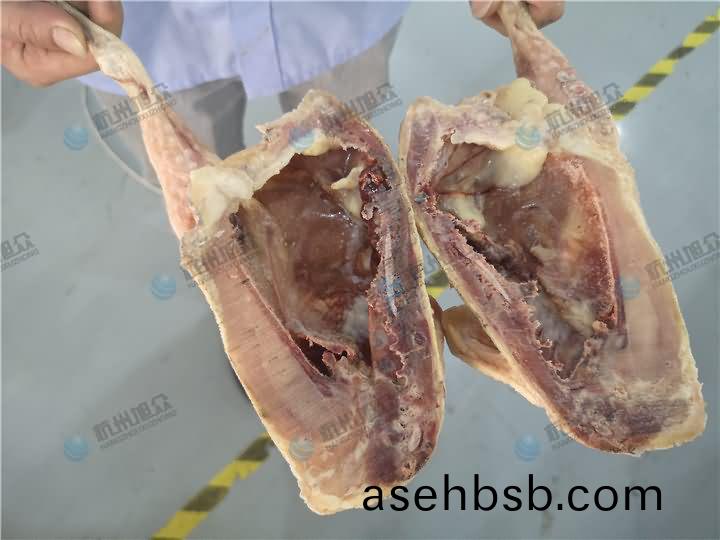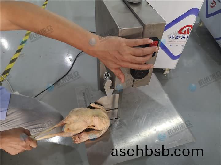 锯骨机除了锯排骨、猪蹄、筒骨类,还能锯鸡、鸭(ya)等禽类,锯骨机锯鸡(ji)架效果: