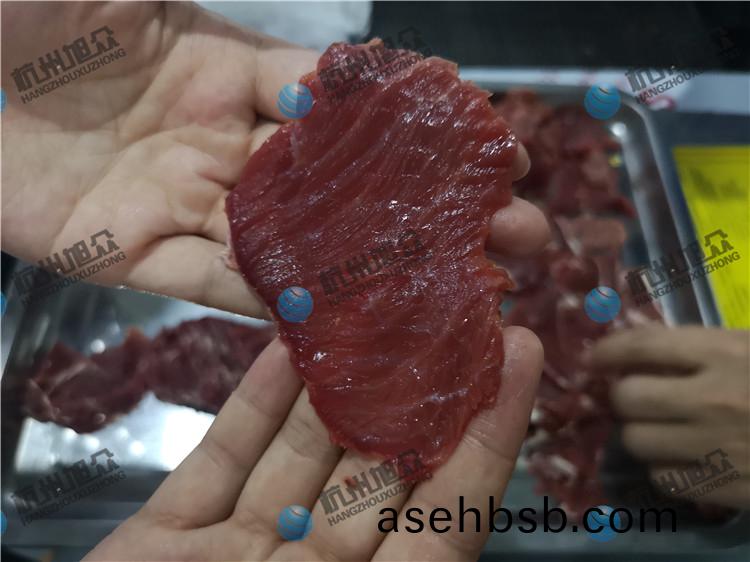 牛(niu)肉(rou)加(jia)工厂(chang)的(de)福(fu)利,全自(zi)动斜(xie)切牛(niu)肉片/鱼片(pian)机(ji)适(shi)用于(yu)肉类(lei)加工厂,鱼(yu)类加工厂(chang),大型餐饮行(xing)业(ye)等单(dan)位。全(quan)自(zi)动斜(xie)切鱼片(pian)机切2.5mm鲜(xian)牛(niu)肉(rou)片效(xiao)果(guo)如(ru)图: