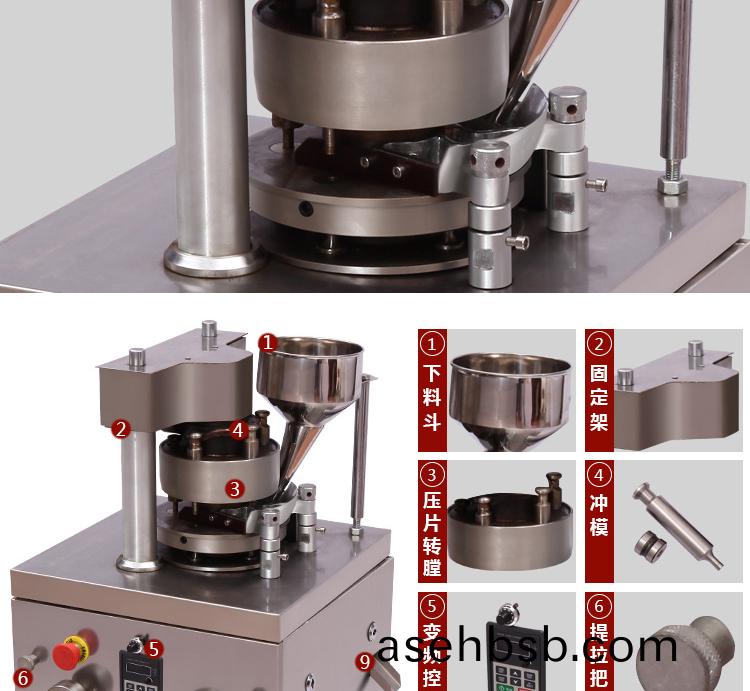 å°�型旋转å¼�压片机有XYP-5ã€�XYP-7ã€�XYP-9三ç§�è§„æ ¼ï¼Œåˆ†åˆ«æœ‰5ã€�7ã€�9副冲模,是目å‰�é‡�é‡�è½»ã€�体积å°�的旋转å¼�压片机。整机为ä¸�锈钢æ��æ–™ç²¾å¯†æœºåŠ å·¥åˆ¶ä½œè€Œæˆ�,支撑架为é“�å�ˆé‡‘æ��料,上ã€�下å�¯ä»¥ç‹¬ç«‹æ‹†å¼€ï¼Œä¾¿äºŽè¿�输。工作室由全é€�明有机玻璃罩密å°�,å�¯æœ‰æ•ˆé˜²èšŠè™«ã€�防尘,清æ´�ã€�美观,工作情况一目了然,废料容易清æ´�。清除残余è�¯ç²‰å’ŒåºŸæ–™æ—¶å�¯ä»¥å°†çŽ»ç’ƒç½©ç§»å¼€ï¼Œé�žå¸¸æ–¹ä¾¿ã€‚