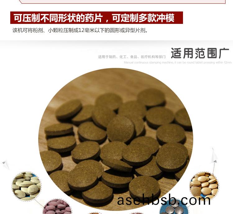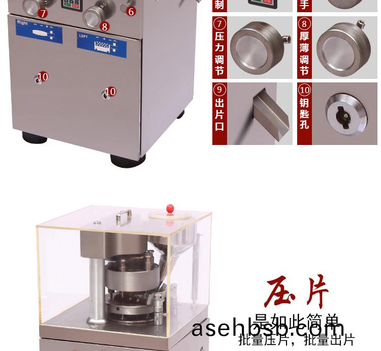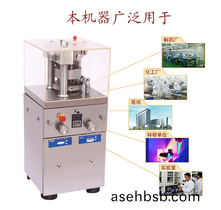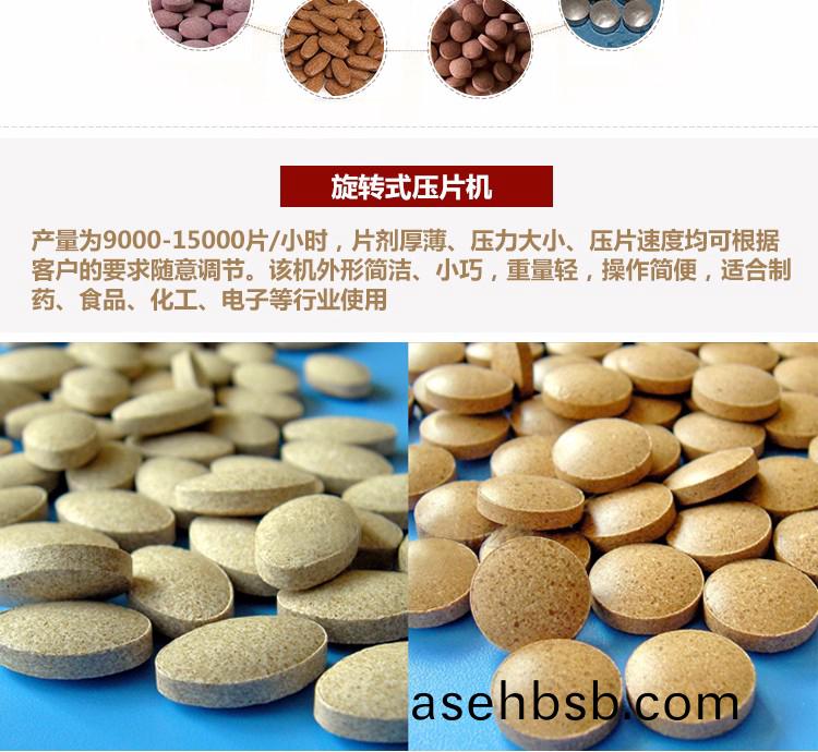 旋转å¼�压片机å�¯å°†ç²‰å‰‚ã€�å°�颗粒压制æˆ�12毫米以下的圆形或异型片剂,产é‡�为9000-15000片/å°�时,片剂厚薄ã€�压力大å°�ã€�压片速度å�‡å�¯æ ¹æ�®å®¢æˆ·çš„è¦�求éš�æ„�调节。该机外形简æ´�ã€�å°�巧,é‡�é‡�轻,æ“�作简便,适å�ˆåˆ¶è�¯ã€�食å“�ã€�化工ã€�电å�ç‰è¡Œä¸šä½¿ç”¨ã€‚é…�有过载ä¿�护装置,当压力过载时,能自动å�œæœºã€‚本机é…�有电ç£�制动电动机和其它安全ä¿�护装置,è¿�行时也能调整与æ“�作。