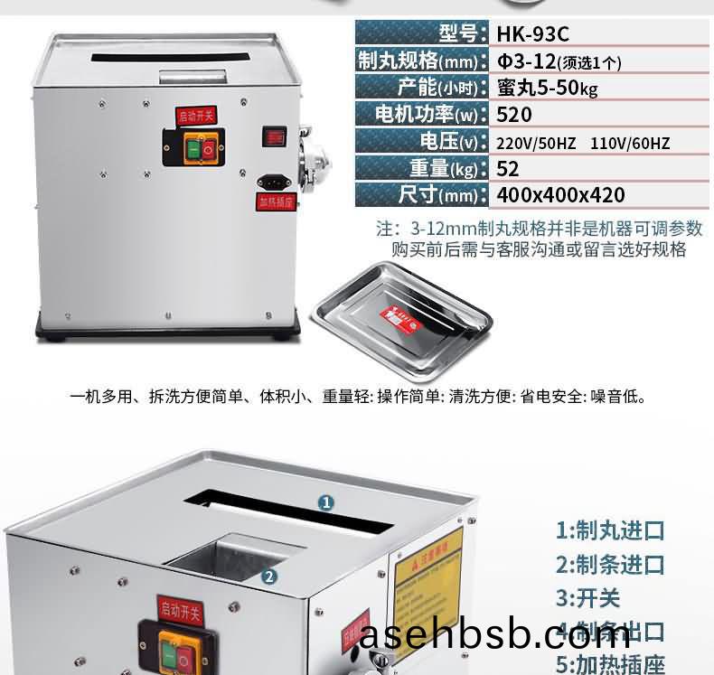 新型高效ä¸è�¯åˆ¶ä¸¸æœºæ˜¯åކç»�3å¹´ç ”å�‘,HK-93C新型高效ä¸è�¯åˆ¶ä¸¸æœºåˆ¶ä¸¸æ•ˆçŽ‡æ¯”ç›®å‰�普通制丸机è¦�å¿«5-10å€�,具有直接出æ�¡ï¼Œæ›´æœ‰è¾…助æ�‰è�¯å›¢åŠŸèƒ½,æ�‰å‡ºçš„è�¯å›¢æ›´æœ‰å�¯å¡‘性,彻底解决æ�‰è�¯éš¾é—®é¢˜,制丸更æ�¢ä¸�å�Œå¤§å°�è�¯ä¸¸æ¨¡å…·æ›´æ–¹ä¾¿ï¼Œæ¸…洗也更简å�•,整机ä¸�é”ˆé’¢åˆ¶é€ ï¼Œè�¯ä¸¸æˆ�型滚轴ç»�è¿›å�£æ•°æŽ§è½¦åºŠåŠ å·¥ï¼Œåˆ¶æˆ�çš„è�¯ä¸¸åœ†æ¶¦å¹³æ»‘,æ¯�ç²’è�¯ä¸¸è´¨é‡�å¹³å�‡ï¼Œå�¯ä»¥ä¸�用å†�使用抛光机,æ“�作简å�•迅速,ä¿�养方便,丸粒大å°�éš�用户è¦�求定制皆å�¯ï¼ˆ3至12毫米)。