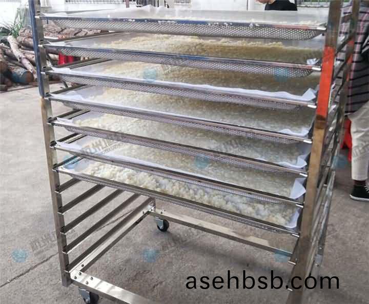 4、银耳片都摆放好后推(tui)入热泵烘干房中,因为物料不(bu)同烘干时间不一致