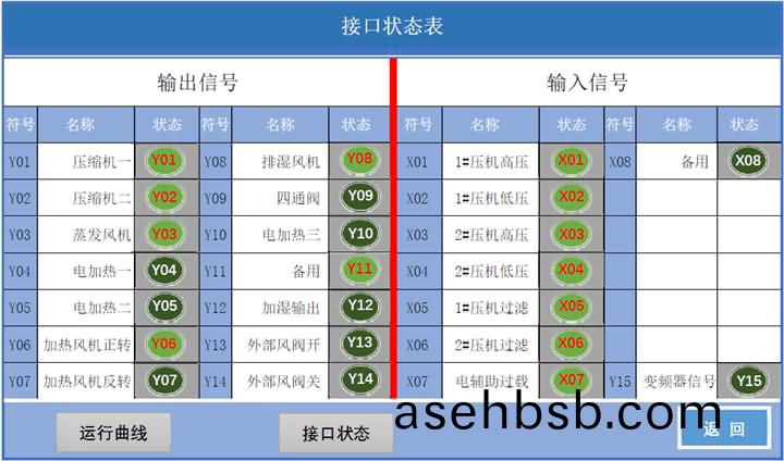 运行可(ke)以(yi)查看现(xian)状(zhuang)态(tai)烤房(fang)的温度湿度,环(huan)境温度(du)、希望达(da)到的(de)温(wen)度(du)湿度、膨胀(zhang)阀(fa)的工(gong)作(zuo)状(zhuang)态(tai)、盘管(guan)温(wen)度、回气温度、排(pai)气温度等。底(di)部(bu)的(de)【热泵(beng)故障】当(dang)主(zhu)机(ji)发生故(gu)障报(bao)警时(shi),点(dian)击(ji)后(hou)会显(xian)示热泵的(de)当(dang)前故(gu)障。点击【更(geng)多(duo)状态(tai)】可(ke)查看(kan)到(dao)接口状(zhuang)态(tai)及(ji)运行(xing)曲(qu)线。