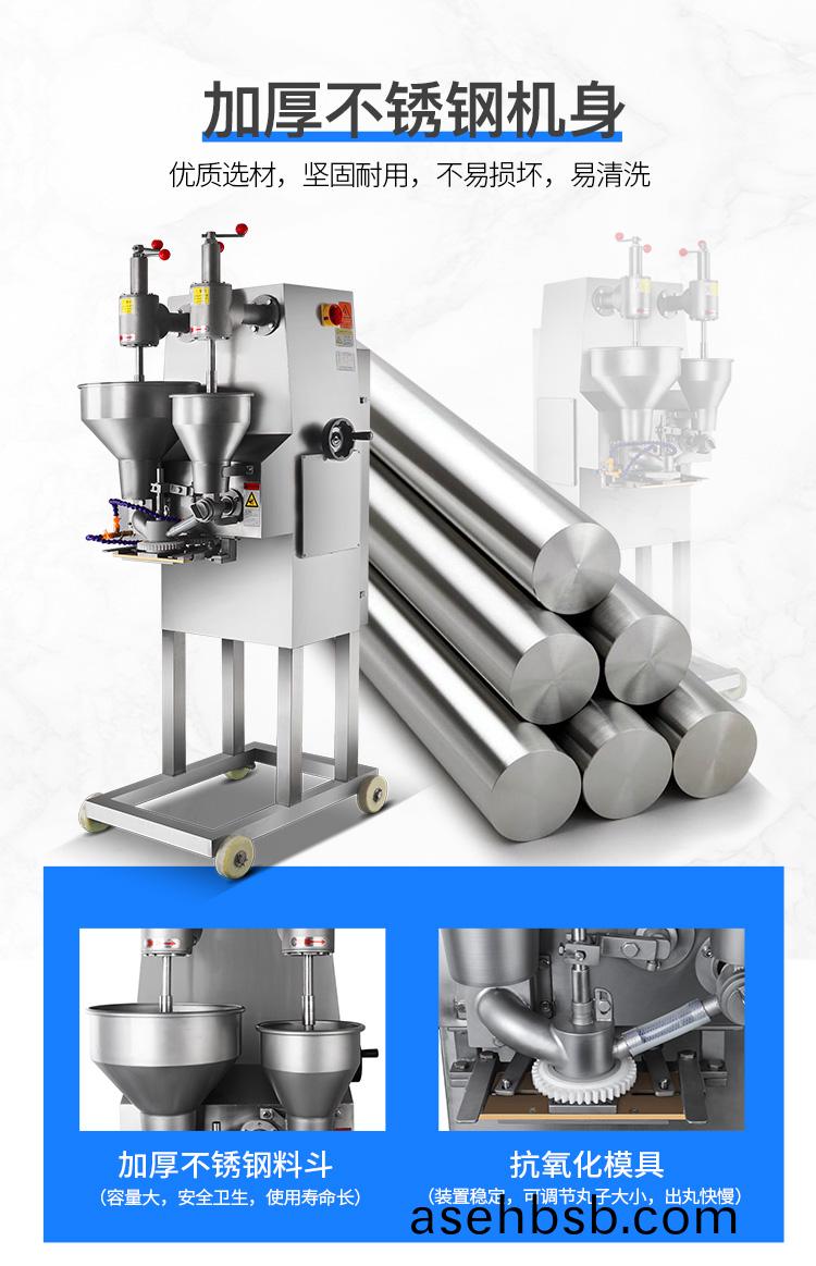 肉(rou)丸(wan)成型(xing)机为(wei)包馅(xian)肉(rou)制(zhi)品成丸(wan)设备,能生产(chan)出(chu)各(ge)种大小(xiao)尺寸(cun)的包(bao)馅鱼(yu)丸(wan)、撒尿牛丸(wan)、猪(zhu)肉(rou)丸、牛(niu)肉(rou)丸(wan)、及包馅(xian)贡丸等,并(bing)可(ke)做不(bu)包(bao)馅的(de)各类丸子。该(gai)设备具有(you)速度(du)快、卫生(sheng)方便、易(yi)拆洗等(deng)特(te)点(dian),可代(dai)替(ti)几十个(ge)人手工(gong)生产(chan),可(ke)为厂家(jia)节(jie)省人(ren)员(yuan)的(de)投入、提(ti)高生产速(su)度。
